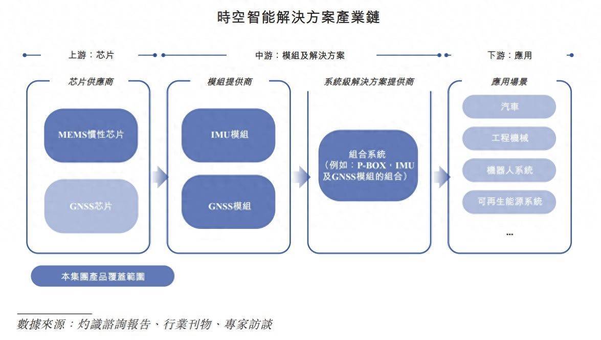 从产业层面看,时空智能解决方案产业链分为上中下游。其中上游为芯片层,供应商提供MEMS惯性、GNSS芯片作为底层硬件;中游是模组及解决方案,模组商输出IMU、GNSS模组,系统商整合多模组成组合系统(如P - BOX + IMU + GNSS);下游覆盖汽车、工程机械、机器人、可再生能源等应用场景,各环节协同实现时空信息从技术到落地的全链贯通。