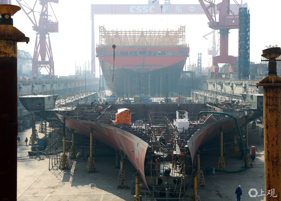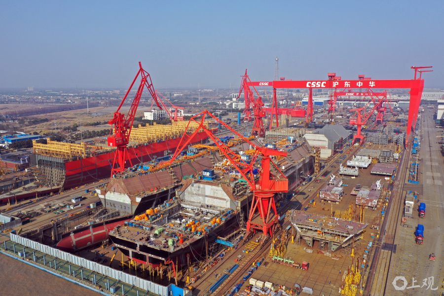 沪东中华造船长兴岛基地一派繁忙,单个船坞内便有四艘大型船舶同时在造。