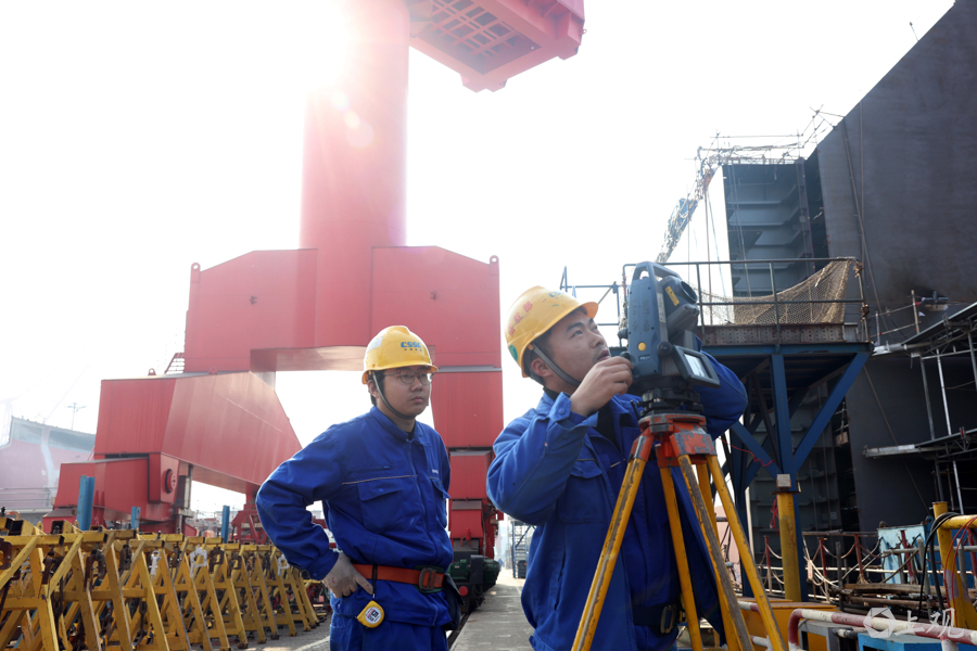 测绘人员在分段装配的现场检校。