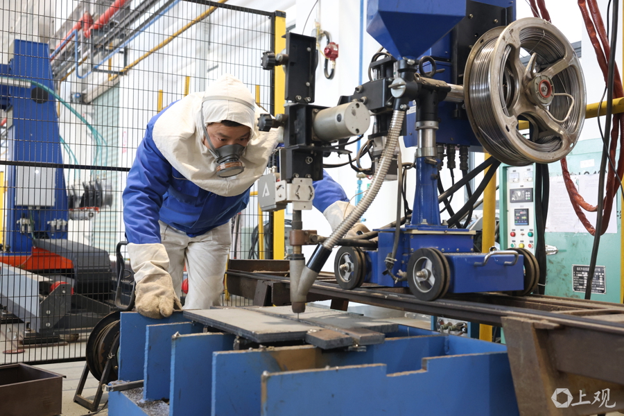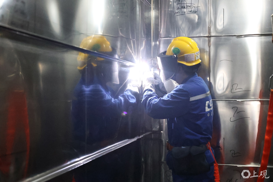 沪东中国技能带头人、大国工匠张冬伟在进行殷瓦钢焊接。