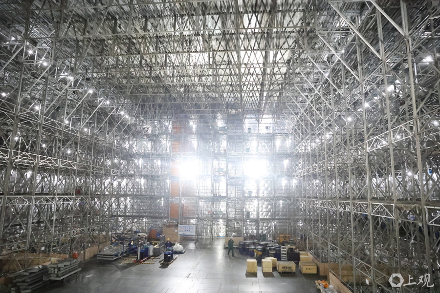 LNG船液货舱内部相当于十层楼高,工人们需要通过脚手架密集分区作业完成焊接。
