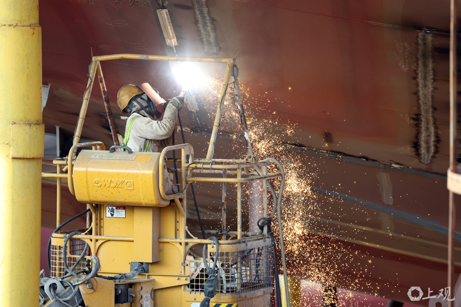 火花四溅的工业美学,工人们进行船体焊接作业。