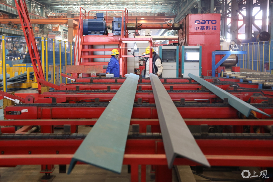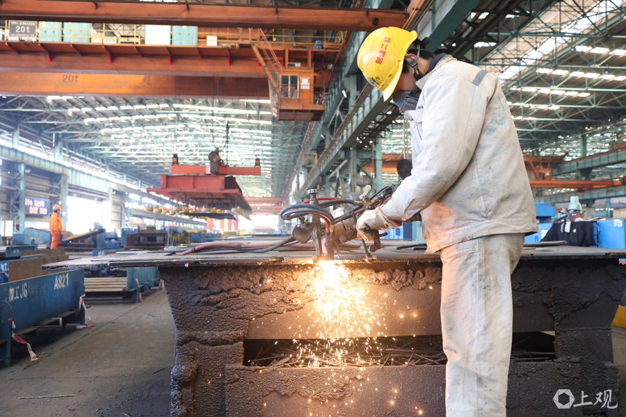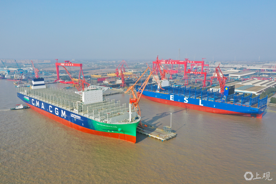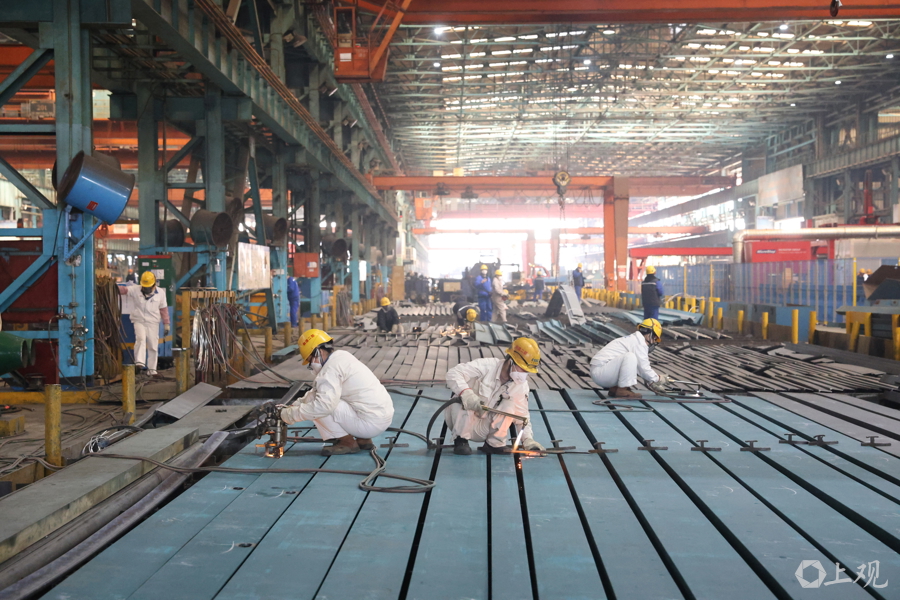新年伊始,中国船舶集团旗下沪东中华造船(集团)有限公司长兴岛新厂区一派繁忙,在建船舶停满船坞,单个船坞内便有四艘同时在建;待交付的船舶披上彩妆屹立于码头,内部忙着进行设备调试;加工车间内机器轰鸣火花四起,工人和机器人协作默契,将一片片钢板加工成分段组件,周而复始形成闭环。